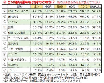 シニアライフ総研が全国の40~80歳代の男女2000名に「余暇・趣味」について調査を行いました。結果は左表にお示しした通りですが、データから読み取れるシニアの生活実態をまとめてみました。